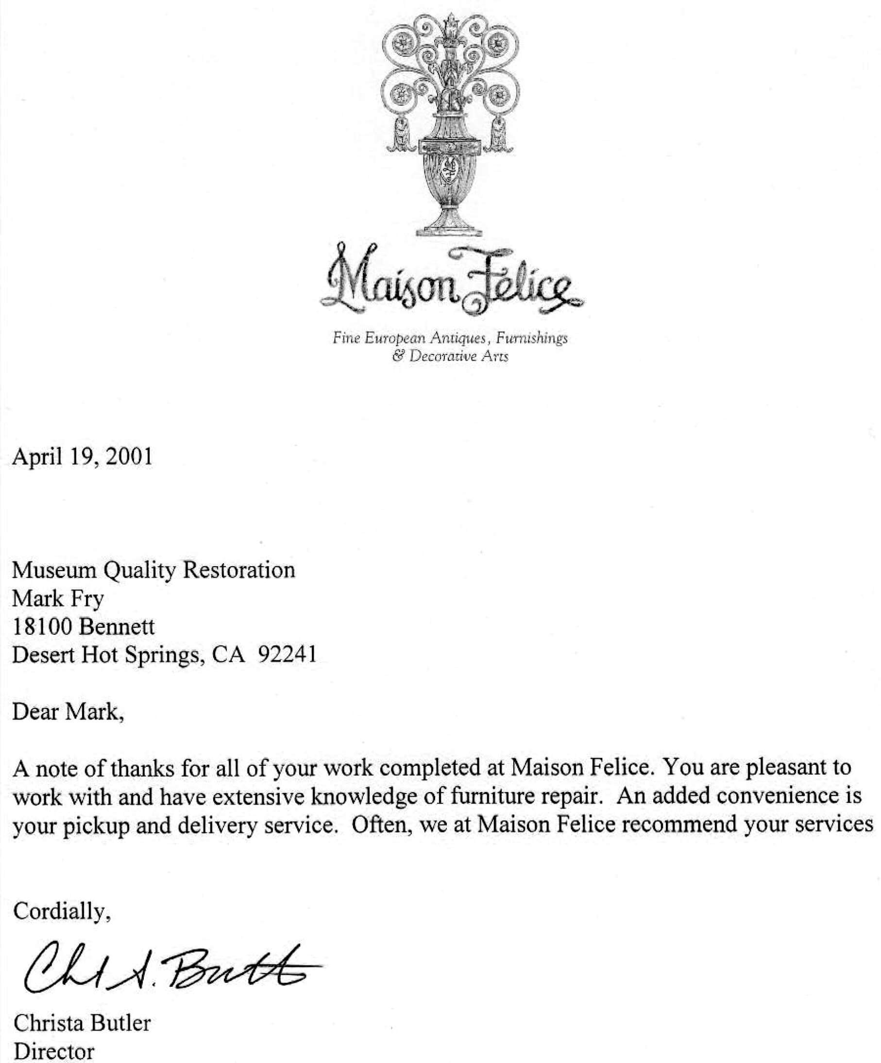 Dear Mark, A note of thanks for all of your work completed at Maison Felice. You are pleasant to work with and have extensive knowledge of furniture repair. An added convenience is your pickup and delivery service. Often, we at Maison Felice recommend your services.