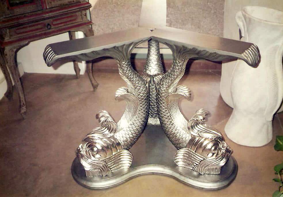 Mark Fry of MQRS serves the area of Palm Desert furniture refinishing.  Mark created this custom silver-leaf finish. This handsome, carved table was hand-glazed with satin lacquer to complete the job. Numerous other custom finishes are available, click the tag Refinishing to see more projects of this kind.