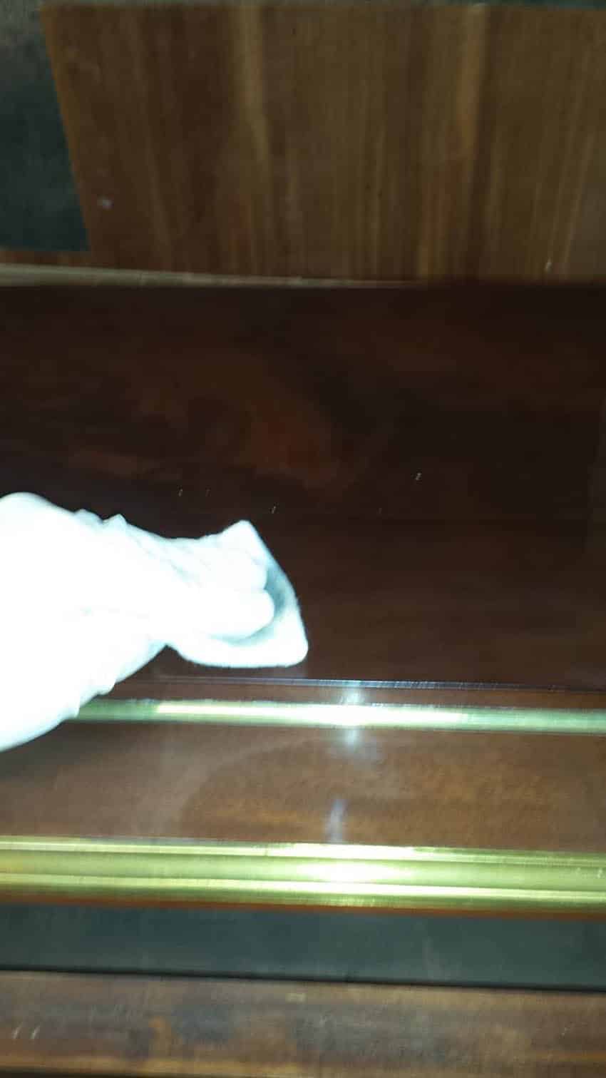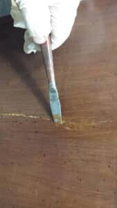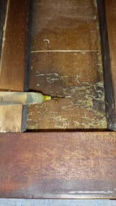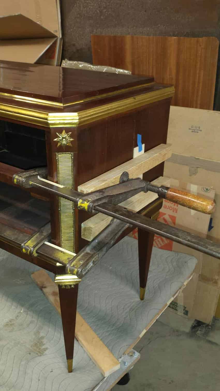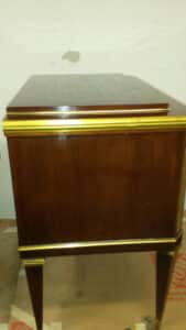 There was extensive woodworm damage as well as cracked and split sides and tops mostly from acclimation where the wood dries out in dry climate areas such as deserts and in the winter it is much drier then in the summer here in the desert, I carefully examined the 2 commodes and injected every worm hole with wood harder and the splits or cracks also, I then epoxy filled the inside cracks and glued and used the drawer guides and glued them as well as they were loose ,also to flatten out and level the sides and tops and used some leveling flat straight pieces of waxed hardwood on the exterior surfaces to ensure all the sides and tops were glued flat and even, I then mixed my epoxy with powdered colors to help match the wood color for easier touchup and filled all the cracks, splits and worm holes with the colored epoxy and  leveled it flat and even. I then cleaned and de-waxed the finish and then touched up where needed. Then I french polished the finish to its original luster bringing them back to their original state and restore their important history in time.